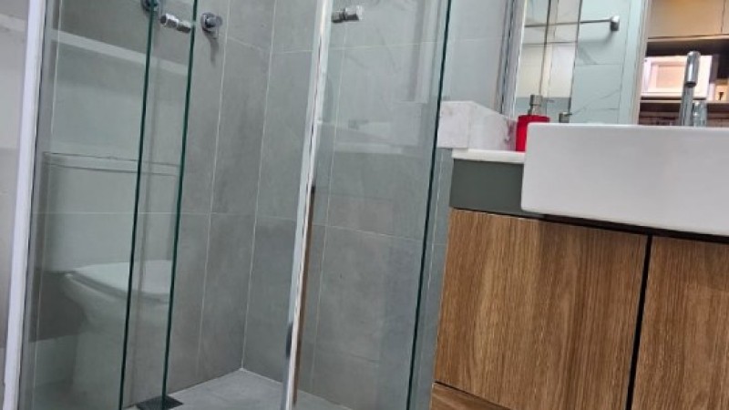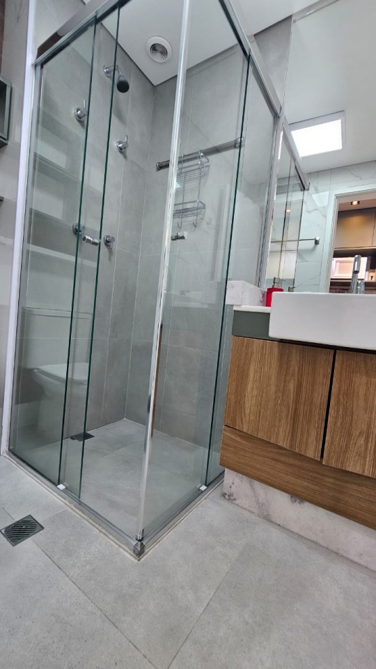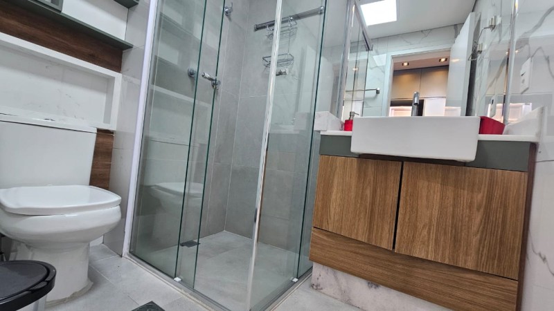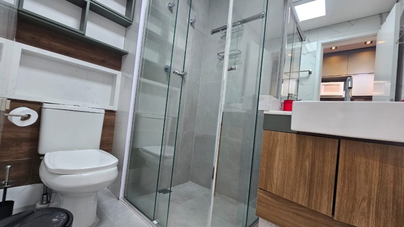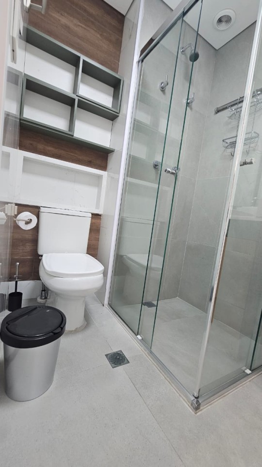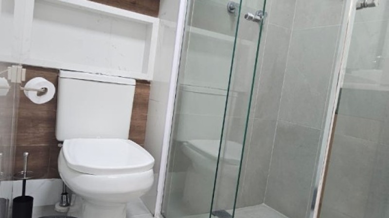 Banheiro: bancada com pia, 01 torneira de água quente e fria com armário embutido em madeira, 01 espelho, 02 acessórios para toalhas de banho e rosto, 02 nichos em madeira, 01 cesto de lixo, 01 chuveiro e box.