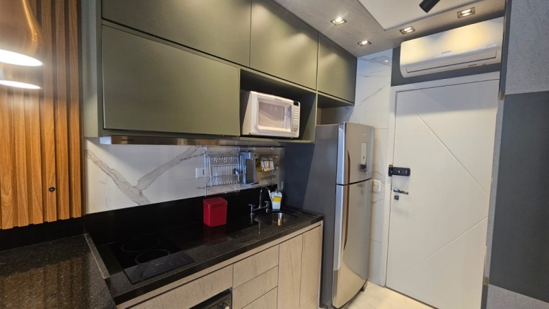 Cozinha completa com armários planejados todos em madeira, uma bancada com pia e 01 torneira de água quente e fria, balcão em pedra com pé de madeira de 02 nichos, 02 pendentes, 01 banqueta de corino na cor vermelha, 01 fogão de 02 bocas por indução, 01 exaustor, 01 Micro-ondas, 01 Frost Free, 01 escorredor de louça 01 filtro de água e 4 nichos de madeira,
