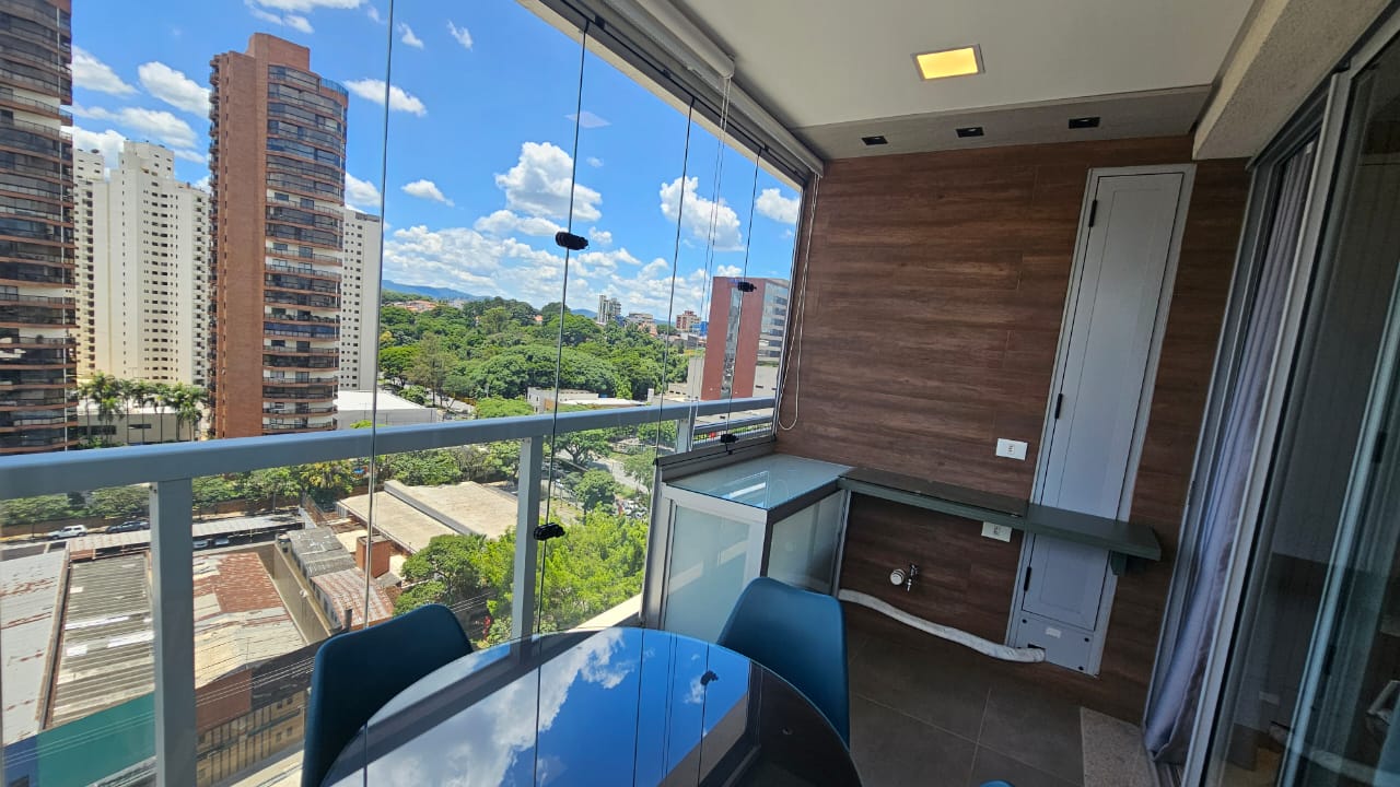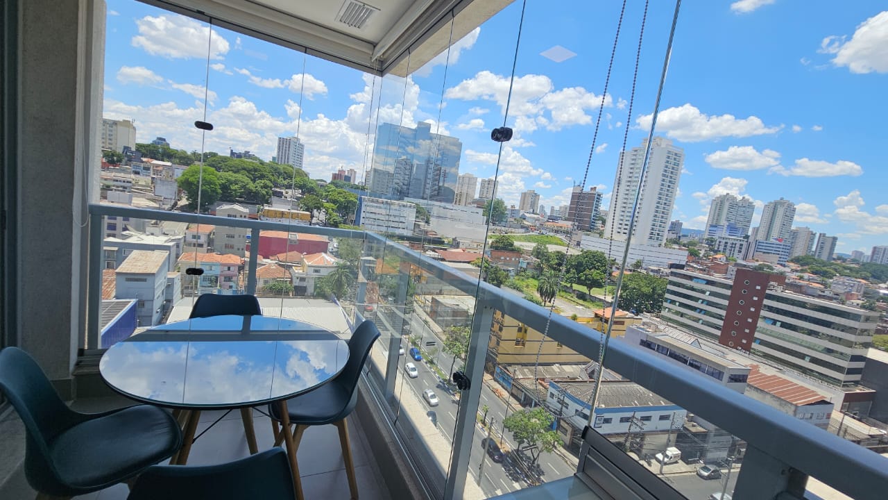 01 mesa com 02 cadeiras, 01 bancada em madeira com tampo de vidro incolor com 02 cadeiras para home office, 5 peças de cortinas rolon e fechamento em vidro.